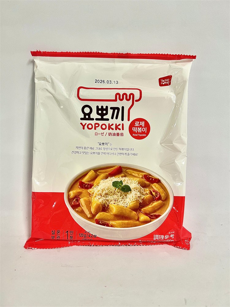 Yopokki Rose- Pct 120g Topokki é uma comida coreana feita de arroz com molho apimentado e agridoce !Essa versão é de "molho picante e creme".Modo de preparo: Colocar a massa, tempero e água (o suficiente para cobrir a massa) numa panela em fogo alto, quando começar a ferver, baixe o fogo e vá mexendo até o molho engrossar e a massa ficar cozida(ficar molinha).